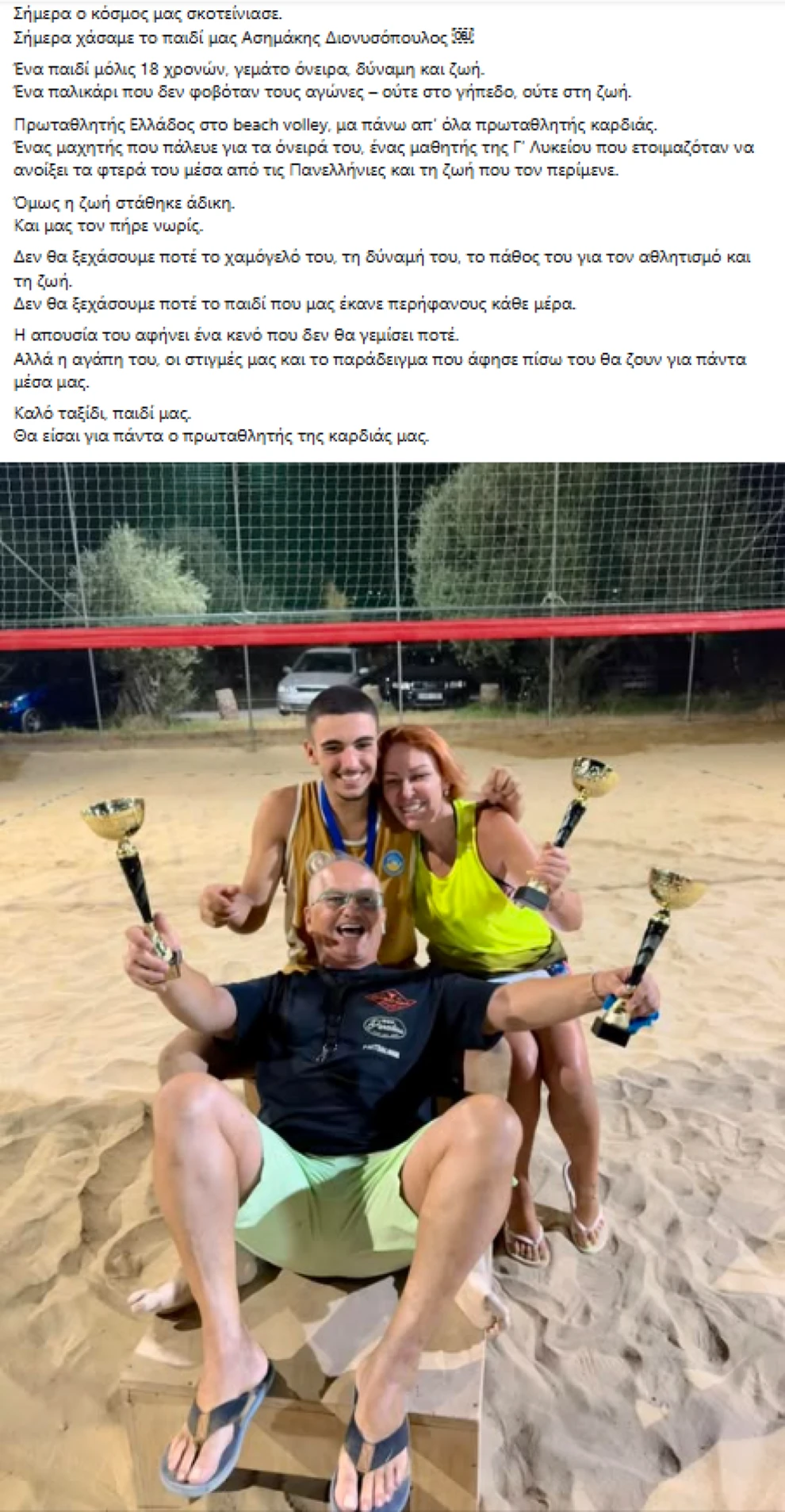 Ο ίδιος αναφέρεται και στις επιτυχίες του 18χρονου στον αθλητισμό, σημειώνοντας ότι ήταν πρωταθλητής Ελλάδας στο beach volley, αλλά –όπως τονίζει– πάνω απ’ όλα «πρωταθλητής καρδιάς».