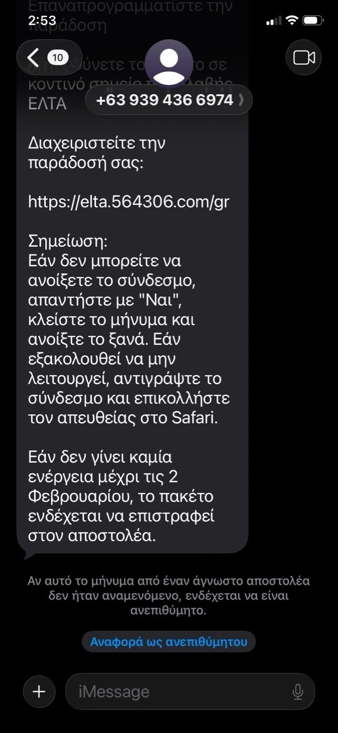 Ωστόσο, μια πιο προσεκτική ματιά αποκαλύπτει ξεκάθαρα σημάδια απάτης. Ο αποστολέας ήταν άγνωστος αριθμός εξωτερικού, συγκεκριμένα με κωδικό +63 (Φιλιππίνες), ενώ ο σύνδεσμος που παρατίθεται δεν έχει καμία σχέση με την επίσημη ιστοσελίδα των ΕΛΤΑ, παρά μόνο χρησιμοποιεί το όνομα για να παραπλανήσει.