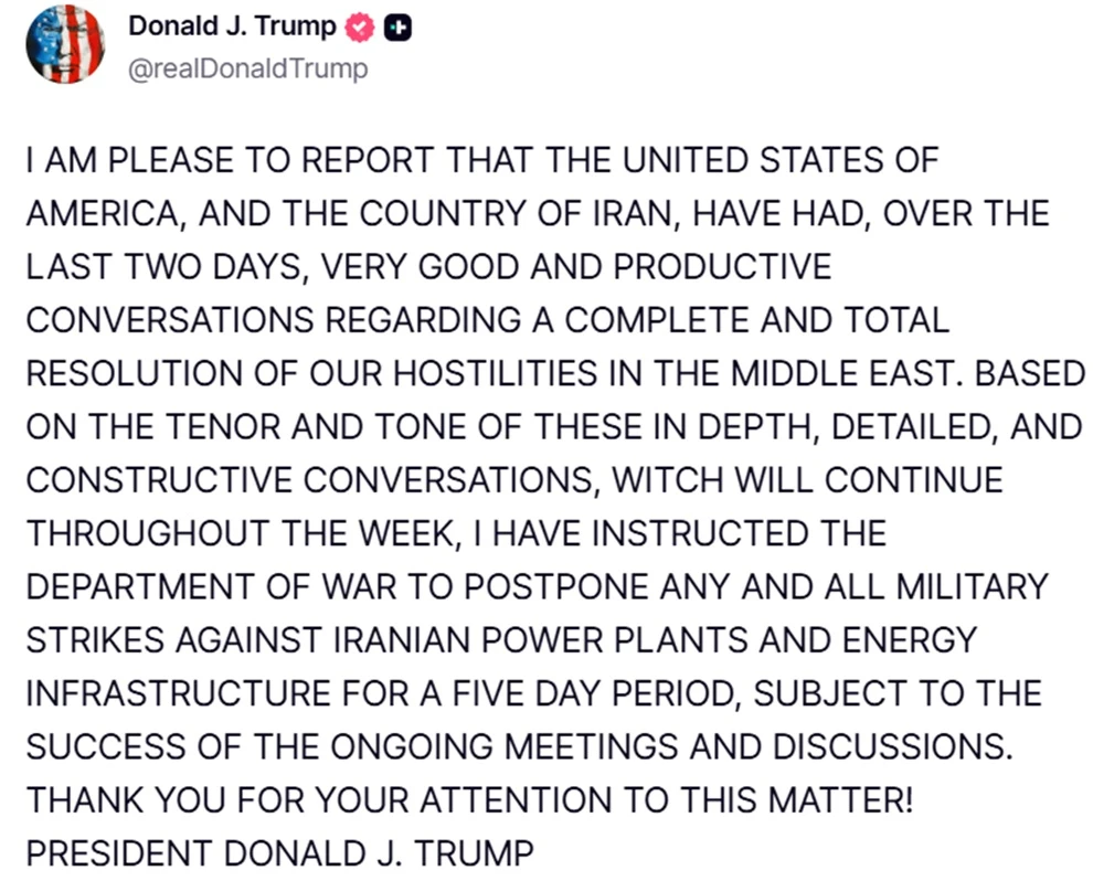 Σύμφωνα με την ανάρτηση, οι συζητήσεις χαρακτηρίζονται ως «σε βάθος, λεπτομερείς και εποικοδομητικές» και αναμένεται να συνεχιστούν καθ’ όλη τη διάρκεια της εβδομάδας. Ο Ντόναλντ Τραμπ σημείωσε ότι, με βάση το κλίμα και τον τόνο αυτών των επαφών, έδωσε εντολή στο υπουργείο Πολέμου να αναβάλει «τα στρατιωτικά πλήγματα» που είχαν προγραμματιστεί κατά ιρανικών εγκαταστάσεων ηλεκτρικής ενέργειας και ενεργειακών υποδομών.