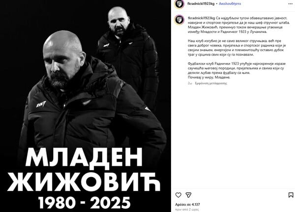 Ο ποδοσφαιρικός σύλλογος Radnicki 1923 στέλνει τα πιο ειλικρινή του συλλυπητήρια στην οικογένεια, τους φίλους και όλους όσους μοιράστηκαν την αγάπη για το ποδόσφαιρο μαζί του. Αναπαύσου εν ειρήνη».