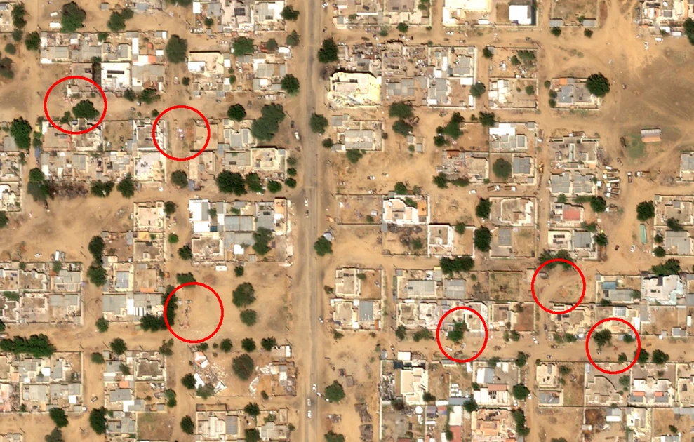 Ανάλυση από το Εργαστήριο Ανθρωπιστικής Έρευνας (HRL) της Σχολής Δημόσιας Υγείας του Yale, το οποίο παρακολουθεί την πολιορκία χρησιμοποιώντας δορυφορικές εικόνες και ανοιχτές πηγές, εντόπισε συστάδες αντικειμένων «συμβατές με το μέγεθος ανθρώπινων σωμάτων» και «ερυθρό έδαφος», που θεωρείται ότι προκλήθηκε από αίμα.